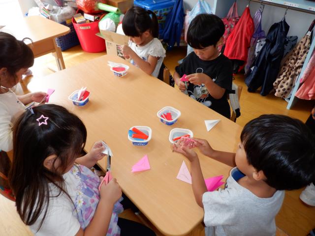 トンボは折り紙を折って、羽と体を作りましたよ。
