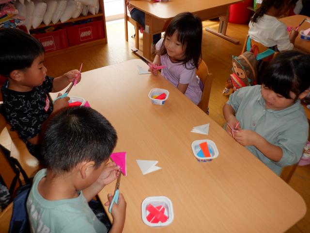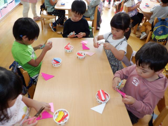 ハサミを使って切り紙をし、コスモスの花を表現しました。少し難しかったところもありましたが、切って開くと可愛い形ができていて、「わぁ~!」と大喜び♪