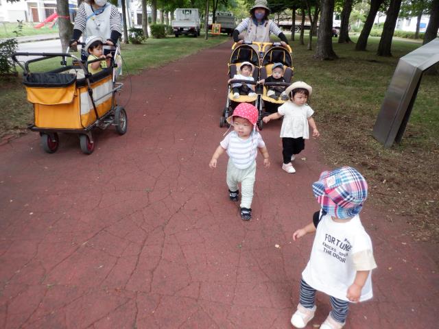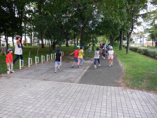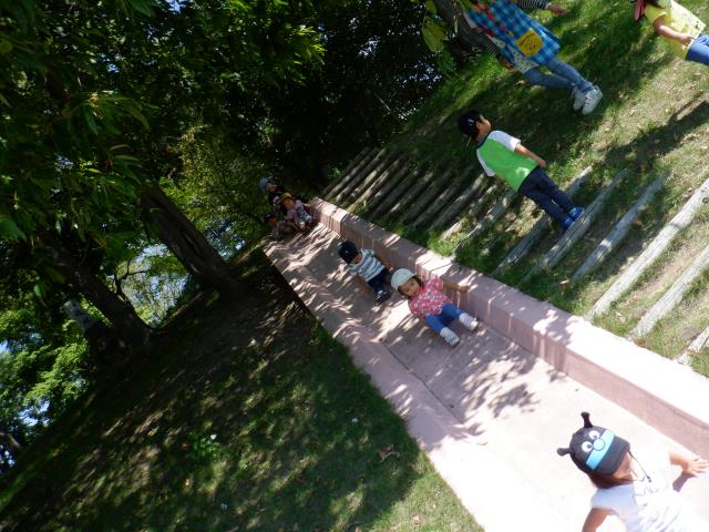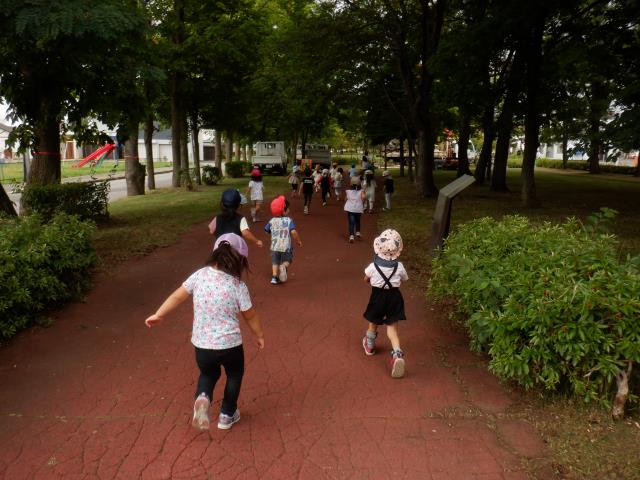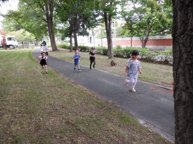 さくらさん、遊歩道でよーいドン!頑張ってゴール目指して走りましたよ。気持ち良く体を動かした後は、鬼ごっこや木の実、葉っぱを拾ったりして遊びました。