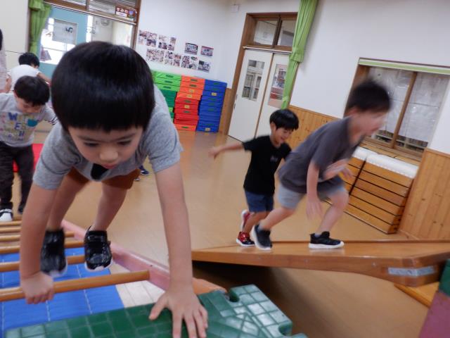 平均台や戸板のぼり、はしご、縄跳びを組み合わせましたよ。