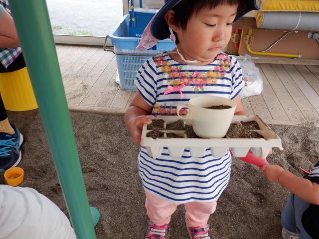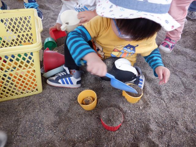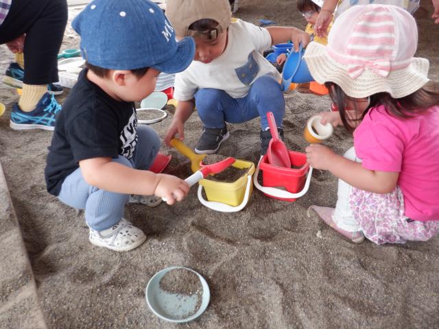 カップに砂を入れてまぜまぜ。お料理作り、お弁当作りをして運んでくれたり、ジュース作りをしていたお友達もいましたよ!砂で色んな遊び方ができたね。