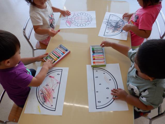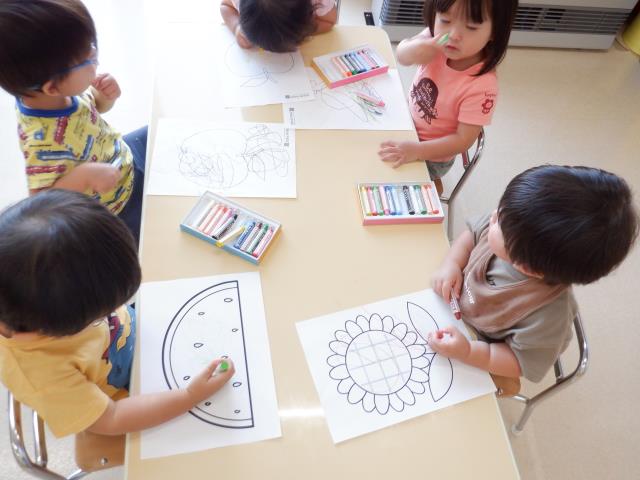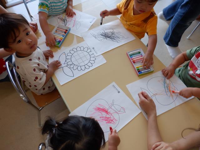 ちゅうりっぷさん、絵が描いてある紙にクレヨンで色を塗りました。自分で好きな色を選んで、自由に表現を楽しんでいます。