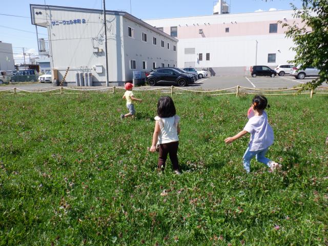 すみれさんは、園庭でリレーをしました。どちらも良いスピードで走り、アンカー勝負になっていましたよ!
