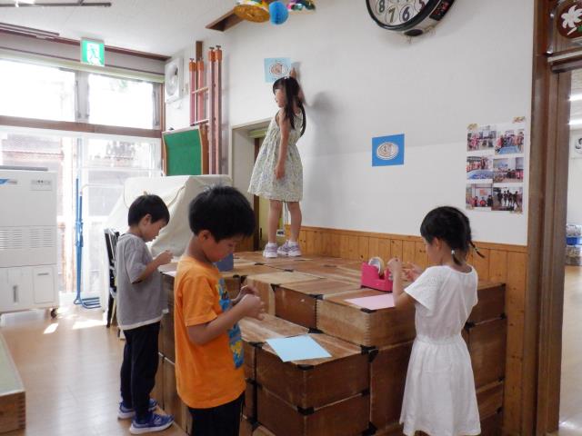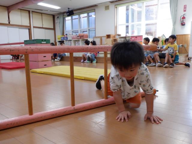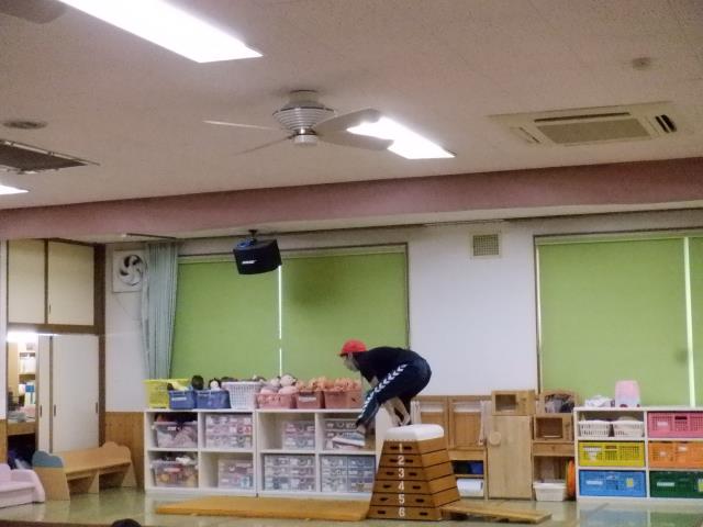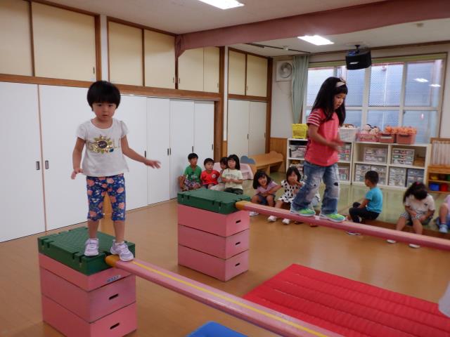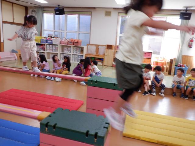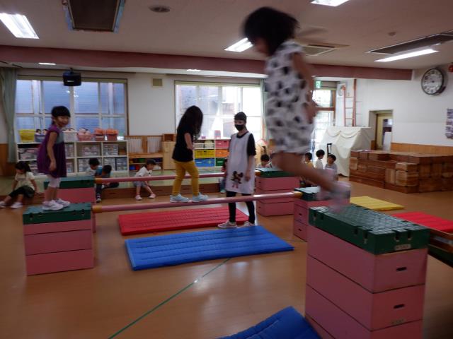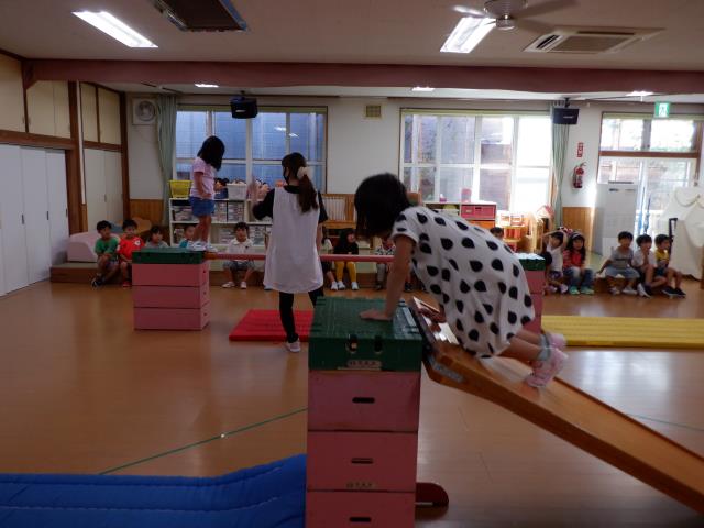 すみれさん、遊戯室で巧技台からのジャンプや戸板上り、平均台、はしごくぐり抜け、マットで前転など、たくさん体を動かして遊びました。