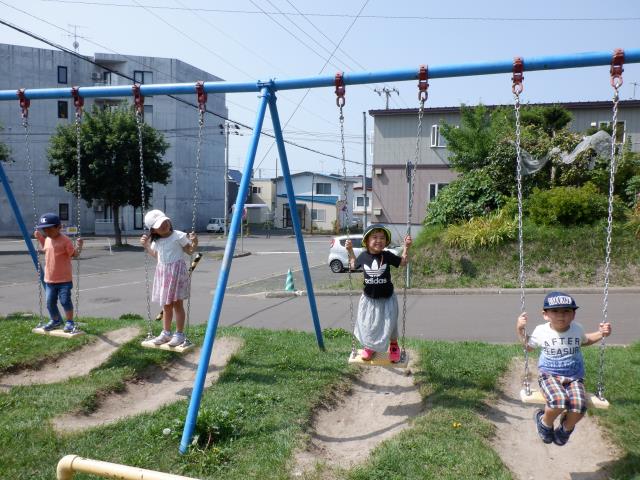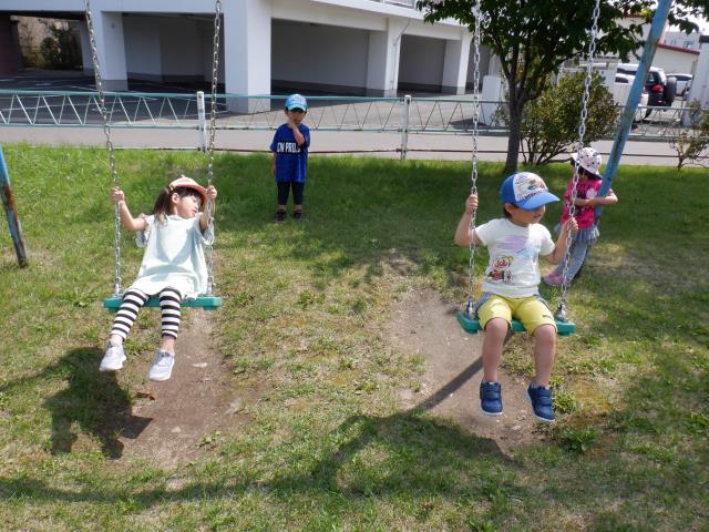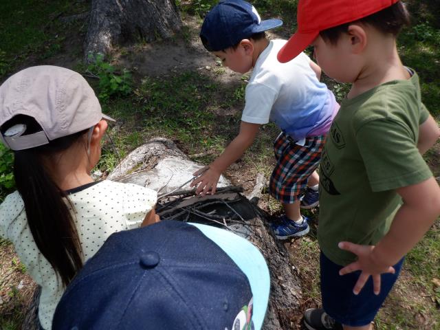 雲梯やブランコなどの固定遊具で遊んだり、枝をたくさん集めて、ごっこあそびも楽しんでいました。