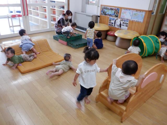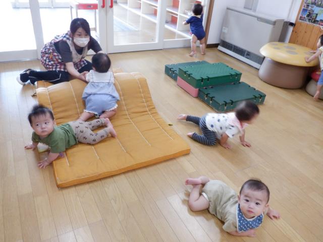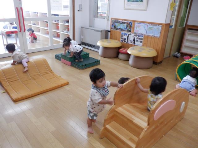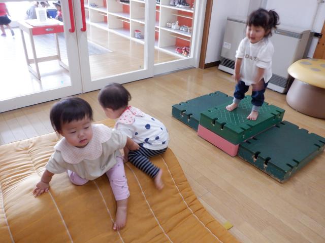 巧技台の階段、トンネル、すべり台、マットの山と、色んな体の動きができるようにすると、ももさんも喜んで好きな場所へ行って遊んでいました!