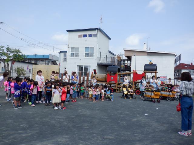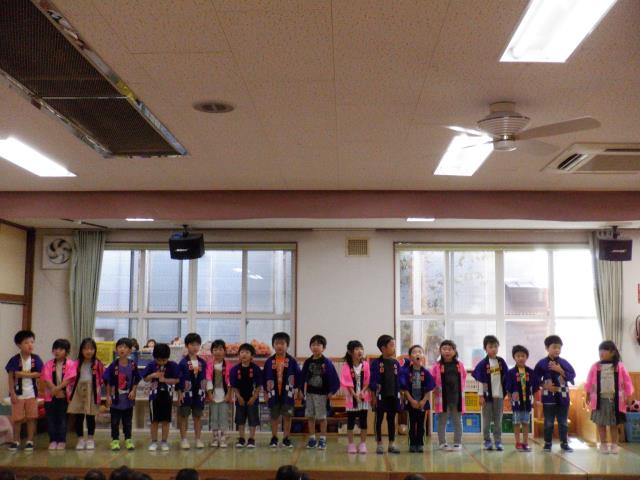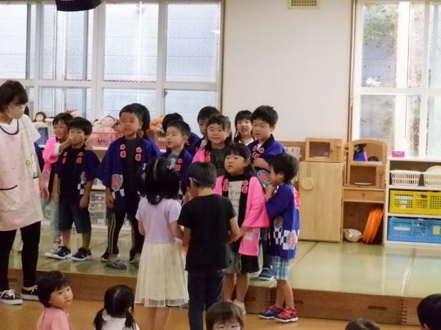 お遊戯室に集まり、ゆりさんがスタンプカードを配ってくれました。明日はゆりさんも出店のお手伝いをしてくれるので、法被を着てやる気満々!