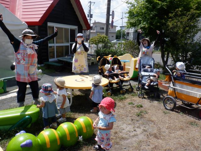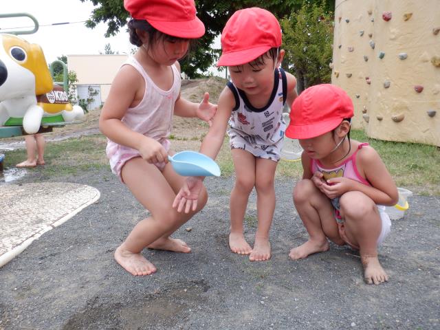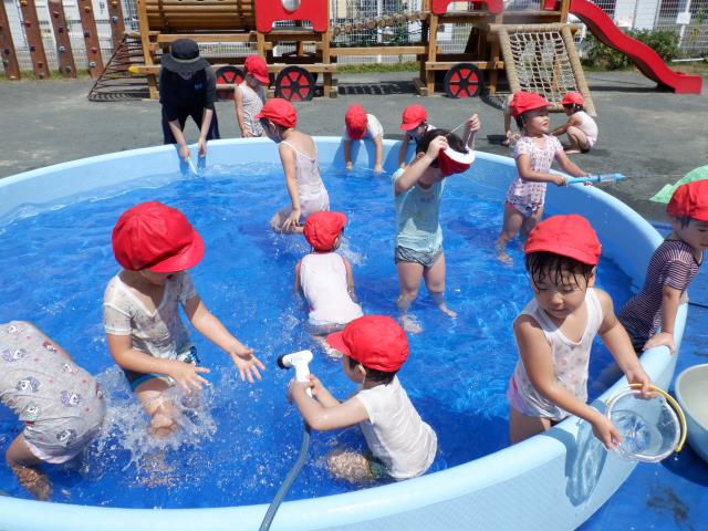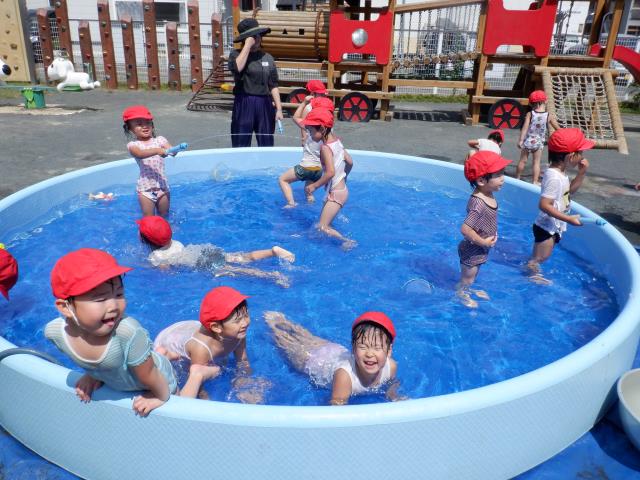 今日も暑かったですね。さくらさんは、園庭に大きな丸プールを出して水遊び!