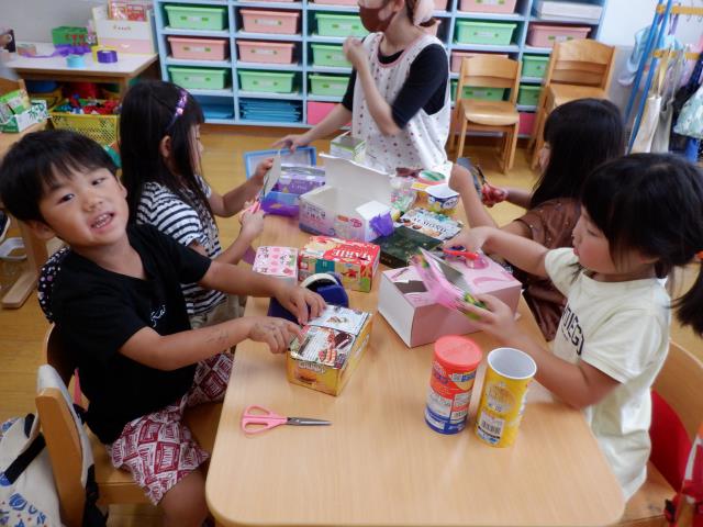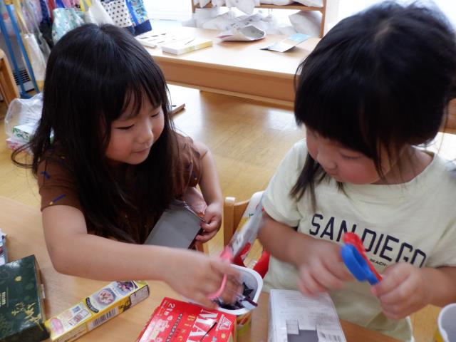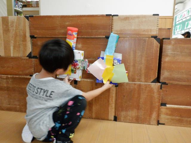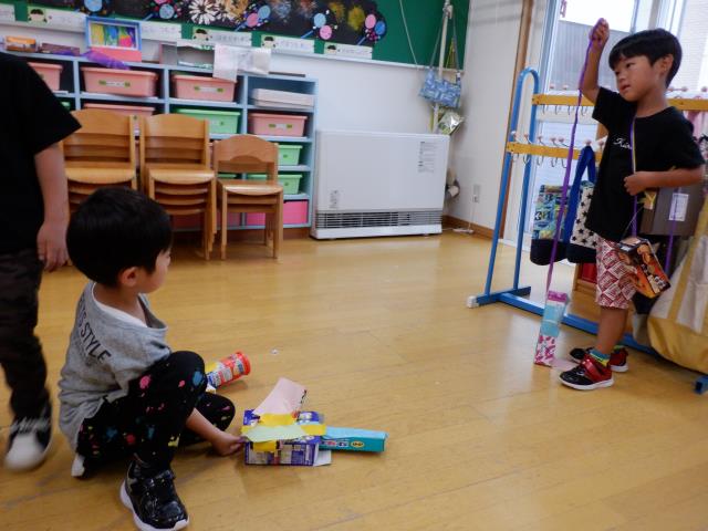 箱と箱をくっつけて、かぶとむしや動物を作り、一緒にお散歩したりと遊んでいましたよ。