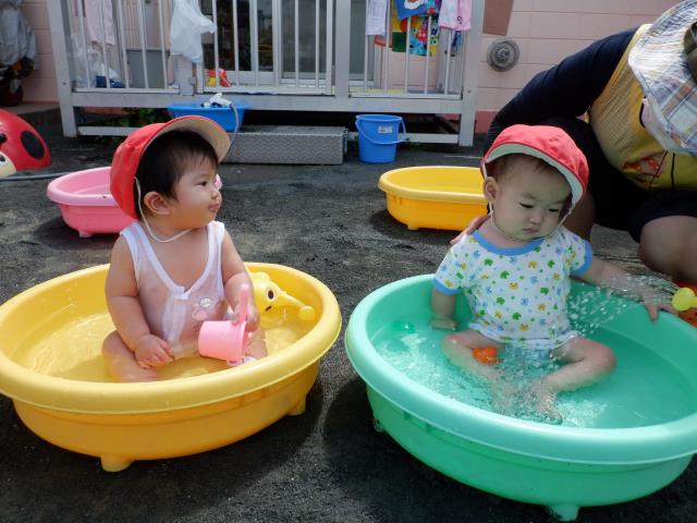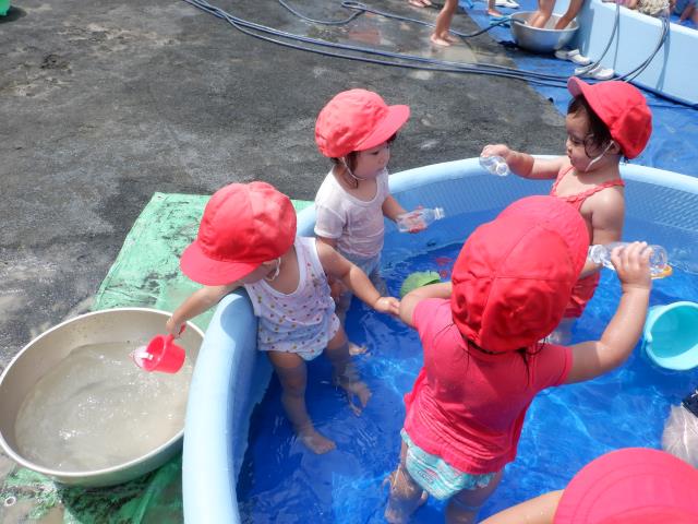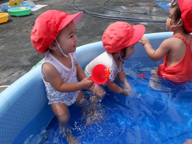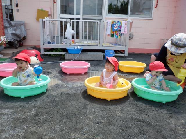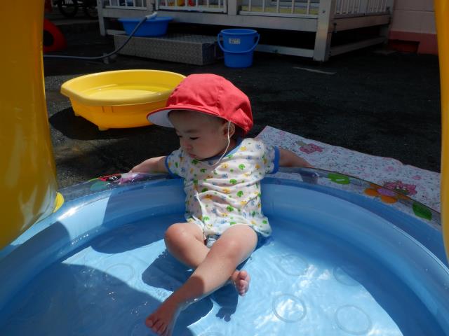 ももさんも水遊びをしています。月齢の高いお友達は丸プールにも入ってみました!とっても楽しんで、水をすくったりかけたりしていましたよ。
