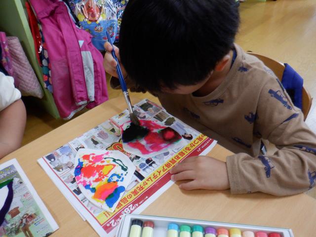 それから、水をつけた筆でマーカーを塗ったところをぬりぬり。きれいな色が滲んで、お花の模様が出来上がりました!