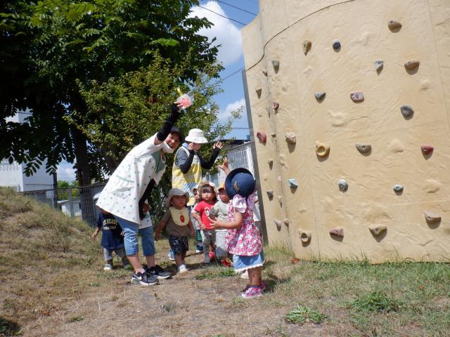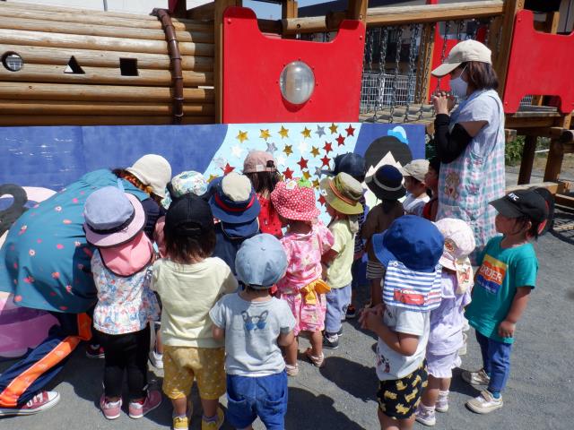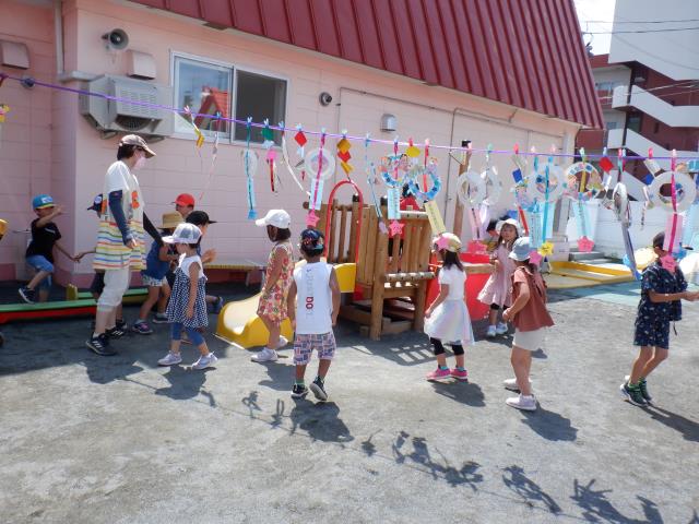 七夕にちなんで、「お星さまを探せ!みんなで天の川を作ろう!!」というゲームをし、みんなで園庭に隠れているお星さまを探して見つけていきました。