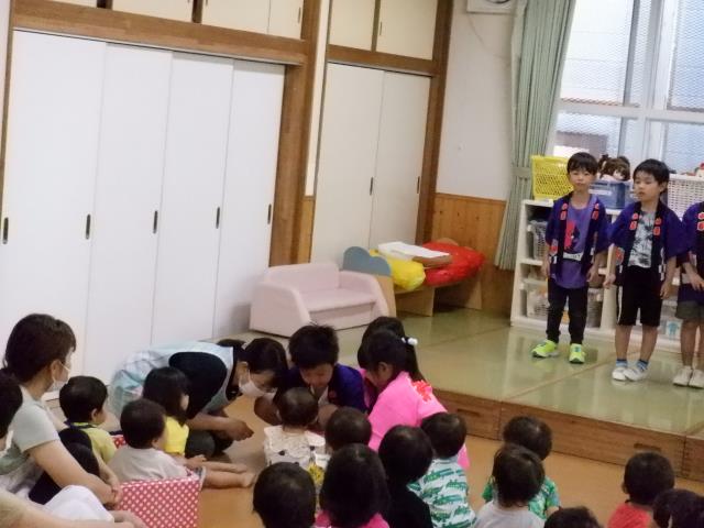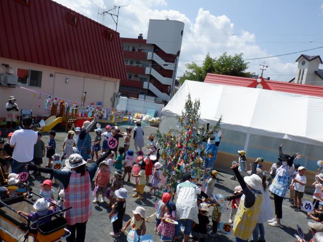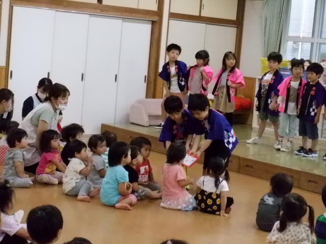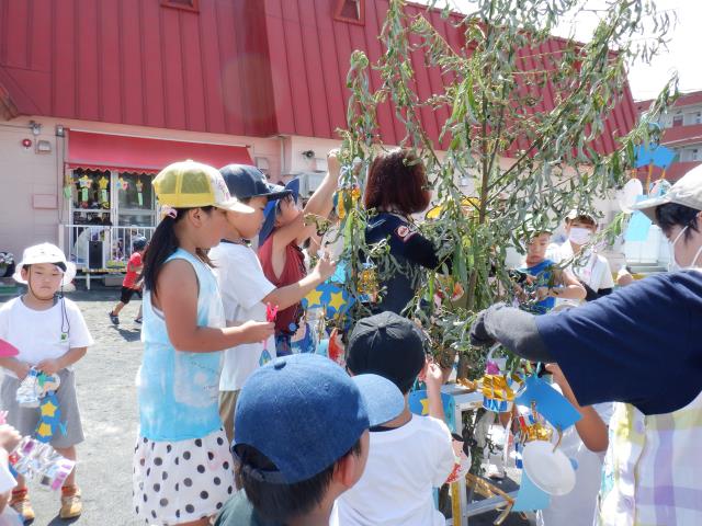 始まる前にお飾りや短冊を飾り、キラキラゆらゆら、とってもきれいになりました。七夕の歌や盆踊りをおどって、園長先生から七夕のお話を聞き、みんなで七夕のゲームをしましたよ!