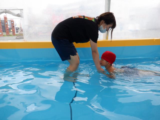 ゆりさんは、色んな動物になって歩いて体を水に慣らし、そのあと一人ずつ先生に手を引いてもらいながら泳いでみましたよ!「楽しい~!」と思わず声がもれていたゆりさんです。