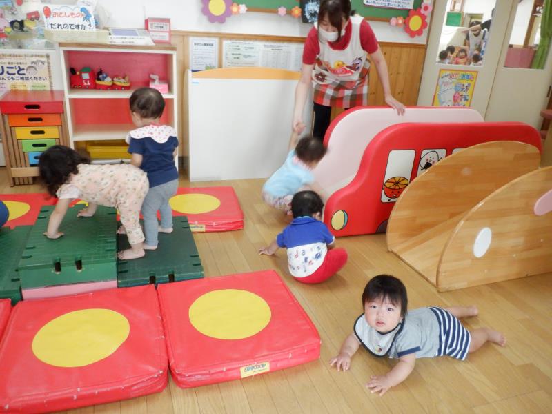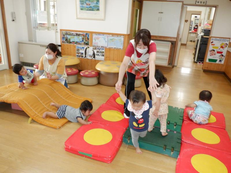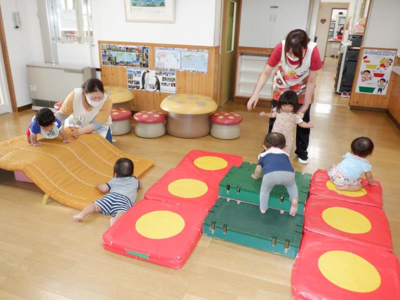 玄関ホールに、マットや滑り台、巧技台で作られた