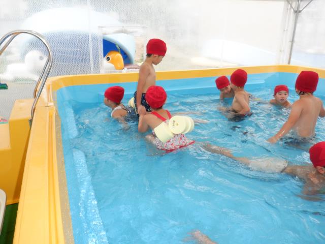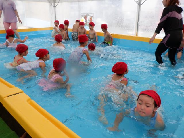 バタ足練習や、男の子と女の子に分かれてプール内を往復したり、ボール遊びもしました!