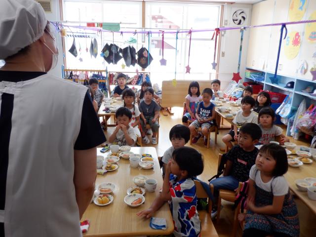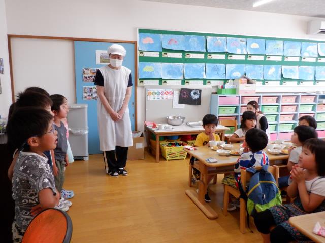 給食先生から、今日いただく鮭は市場から来た魚であること、これは切り身だけれど、いろんな魚の形があること、野菜は体の調子を整えてくれることなど、色んなお話が聞けました。元気なお返事をして、きちんとお話を聞いていたすみれさんでしたよ。