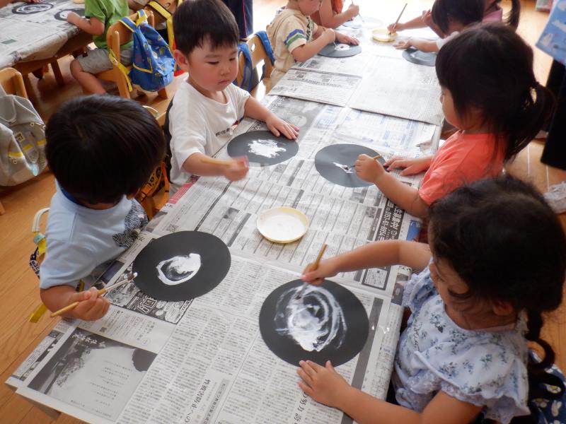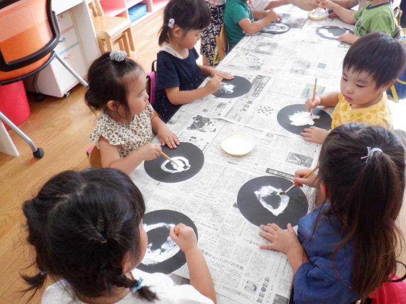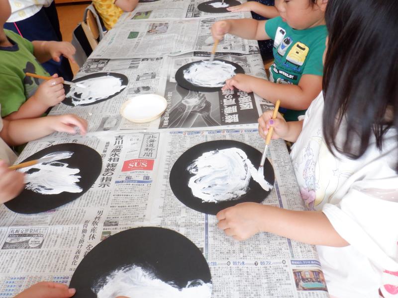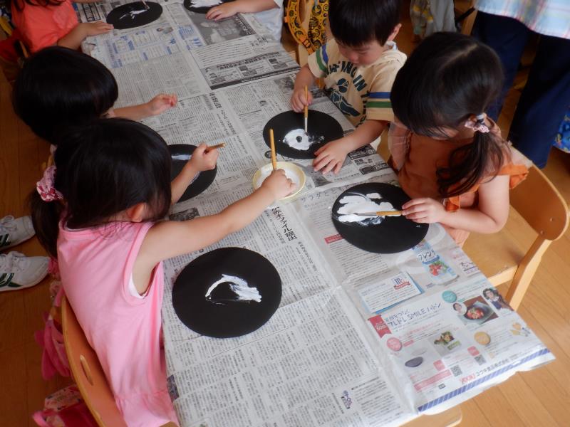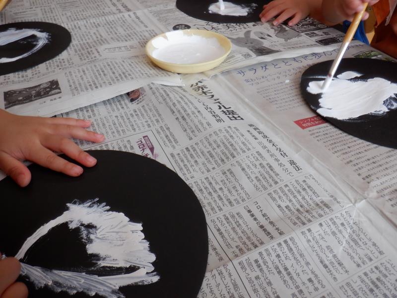 黒い台紙に白い絵の具を、筆でぬりぬり。