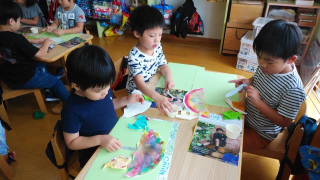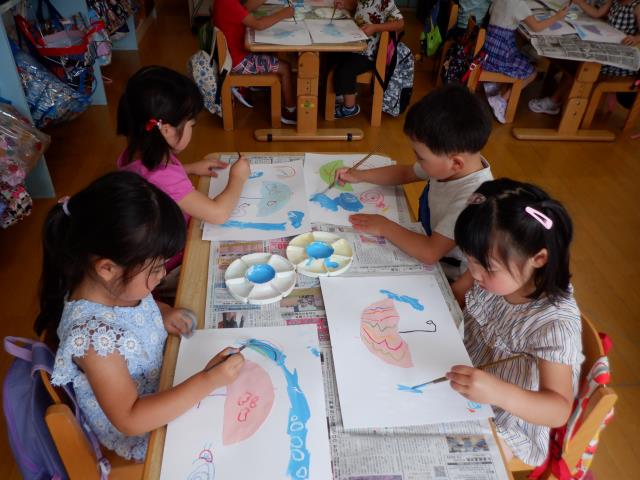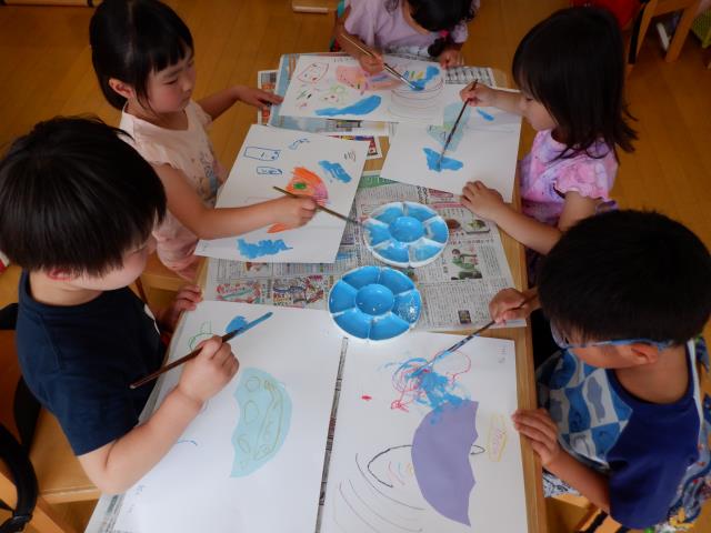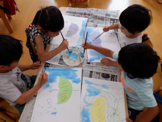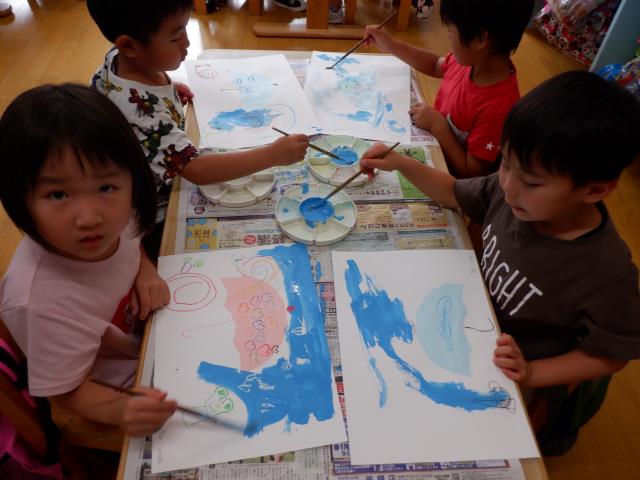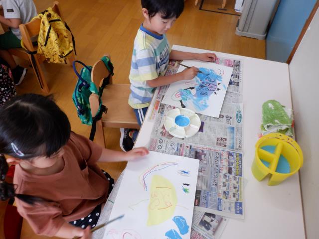 白いクレヨンで描いたところに、今日は水色の絵の具を塗って、はじき絵をしました。絵の具がみんな楽しくて、大雨になっている子もチラホラ…