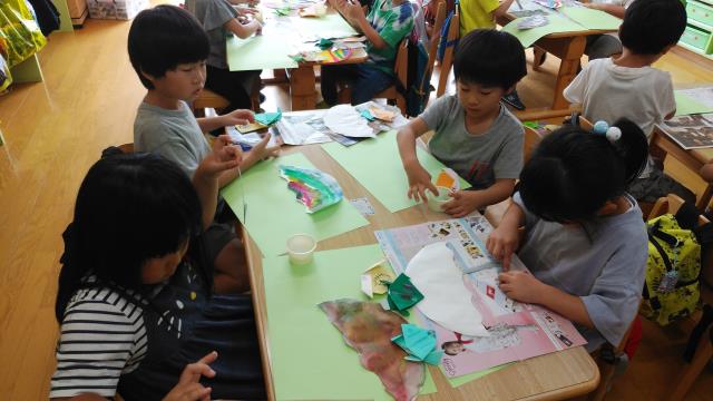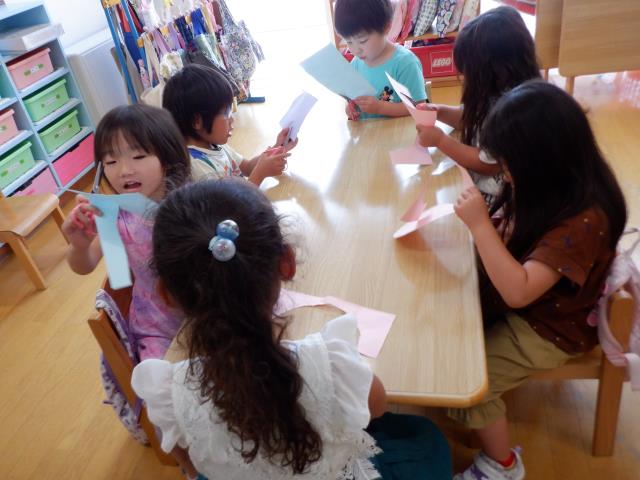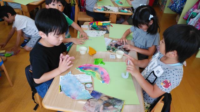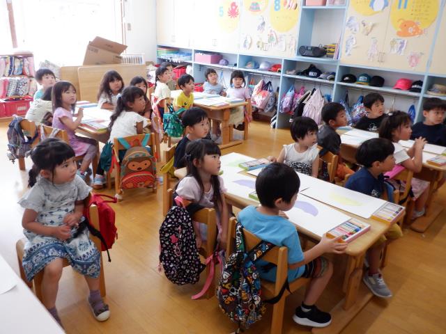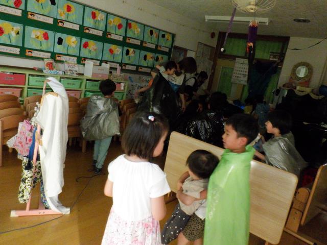 お部屋を薄暗くして、自分で作ったおばけの衣装を着たゆりさんがみんなを驚かし、他のクラスも巻き込んで一緒に雰囲気を味わいました。怖がるお友達もいましたが、暑い日にはピッタリの催し物でしたよ。