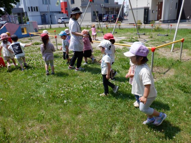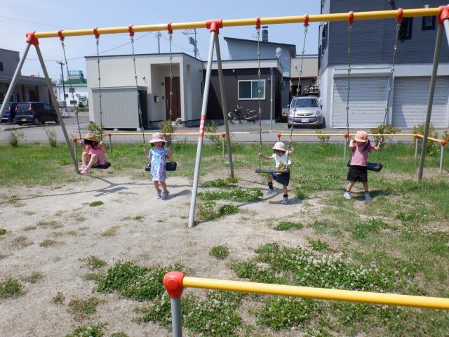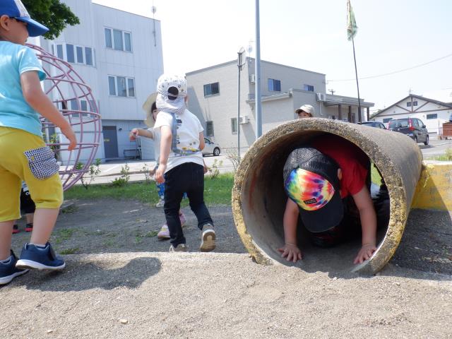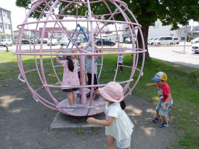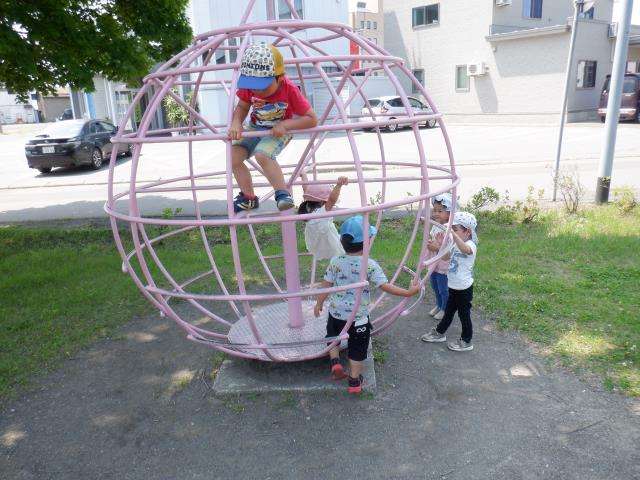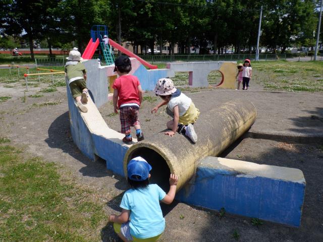 さくらさんは、進級してから初めて本町公園に行ってきました。ブランコやグローブジャングルなどの遊具で遊んだり、トンネルくぐりもしましたよ。