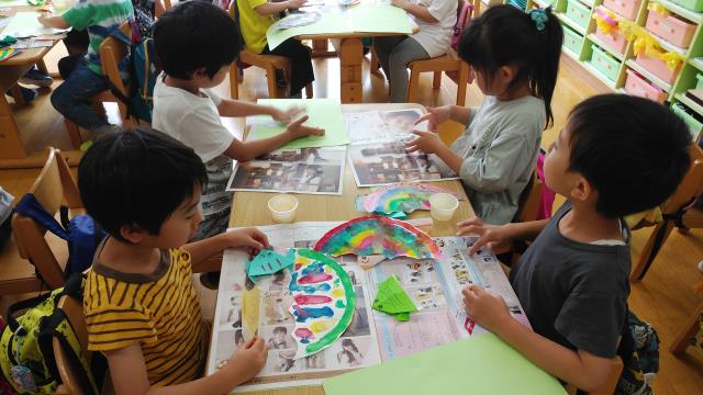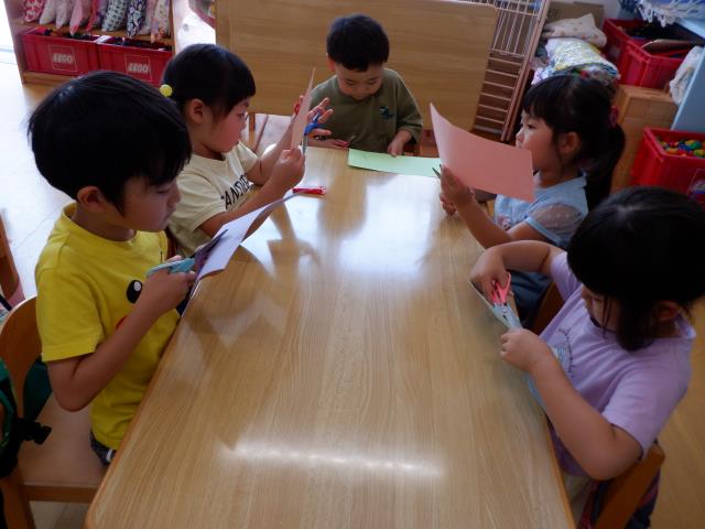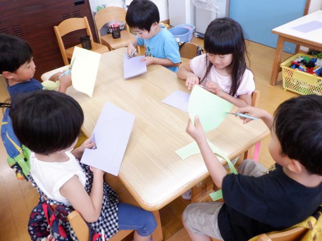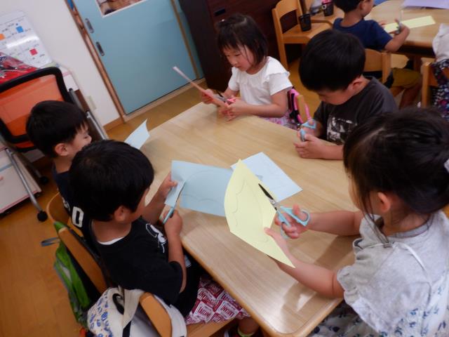 ハサミで傘を切り、真剣な表情の子ども達…波線のところも、上手に切っていました。