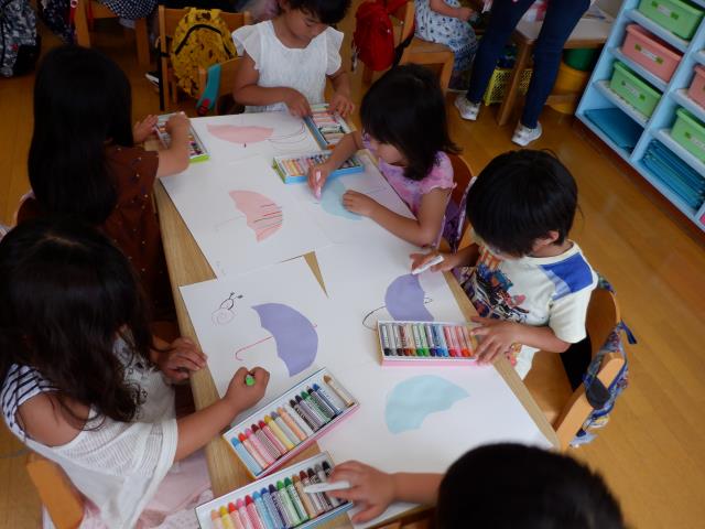 のりで傘を貼って、傘の模様やカタツムリなどクレヨンでお絵かきをし、最後は白いクレヨンで何やら描いていますよ。