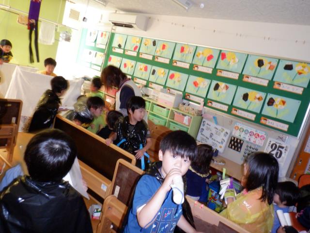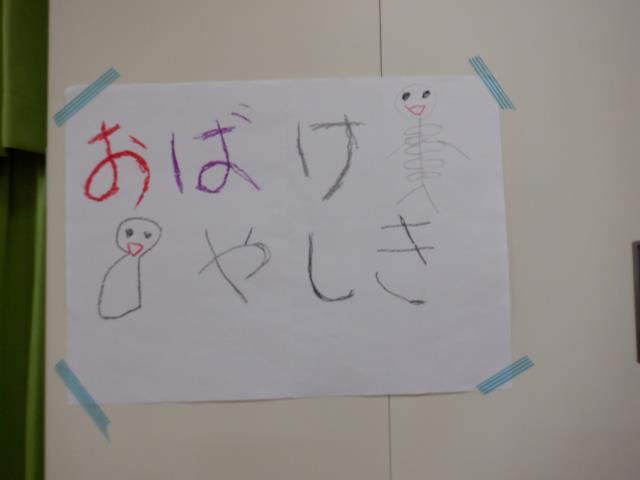 午後のおやつ後、ゆりさんのお部屋から、「キャー!!」と賑やかな声が聞こえてきました。覗いてみると…ゆり組のお部屋が『おばけやしき』に変身!