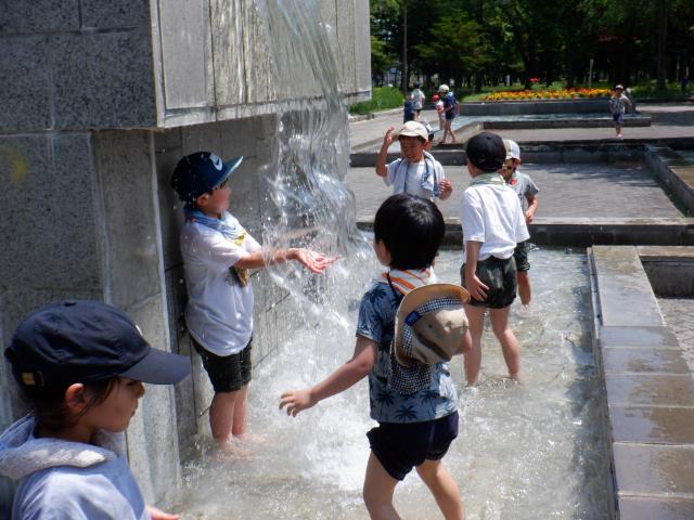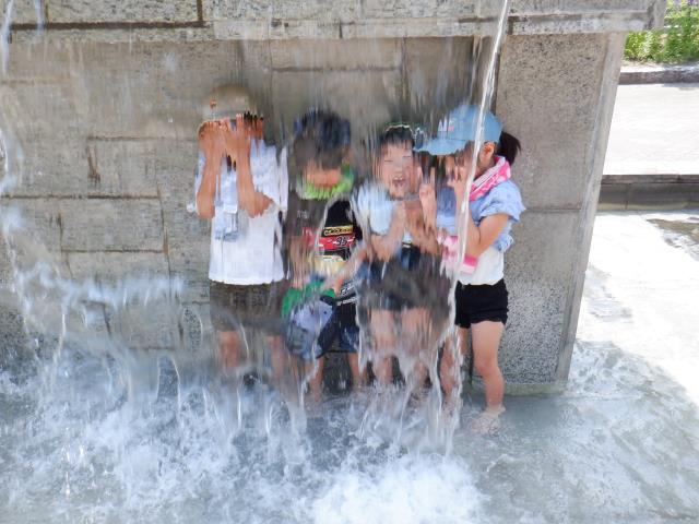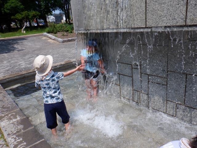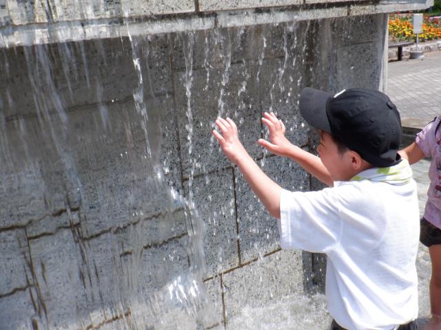 着いてみると、噴水が出ていて大喜び!お水にふれて、暑さの中気持ち良く過ごしてきましたよ。