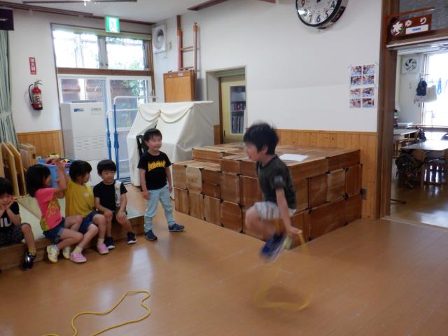 跳び箱、はしご上り、平均台、縄跳びの流れで行いました。跳び箱や縄跳びも、回数を重ねるごとに成長がみられています。縄跳びは、見ているお友達も一緒に数えていましたよ。
