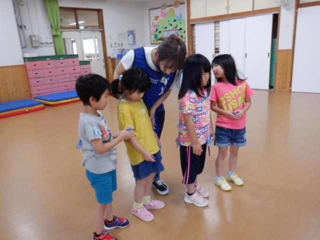 一人3つ洗濯ばさみを持ち、お友達の服に忍者のように”こっそり”付けていきます。付けられたことに気付いたら、自分の洗濯ばさみとしてお友達に付けても良いルールで、付いている洗濯ばさみの数が少なければ勝ちとなります。