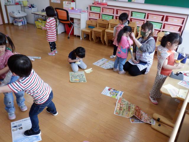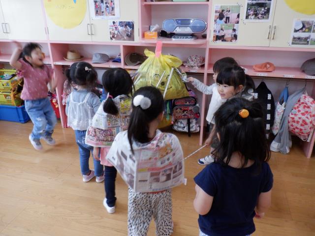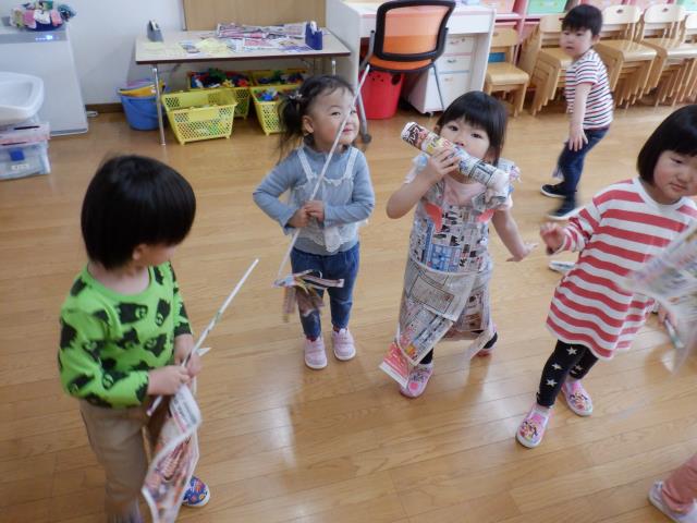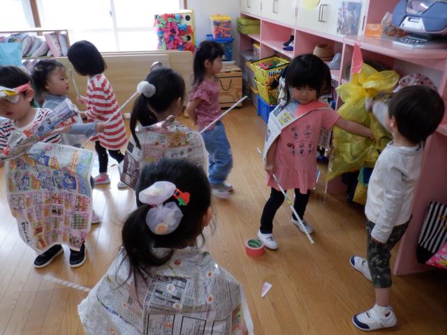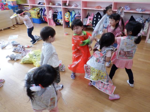 紙で作ったドレスを着て、お姫様に変身するお友達、作ったホウキできれいにお掃除するお友達、ネックレスや帽子を作って身につけたりと、それぞれのイメージで楽しんでいました。