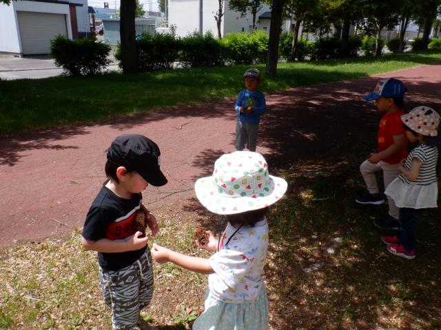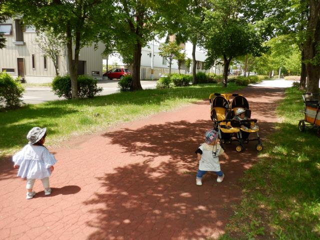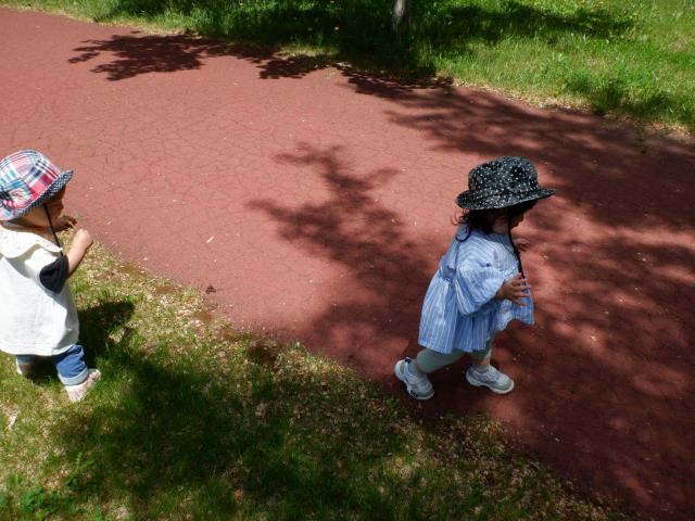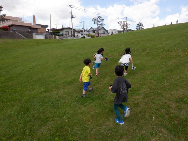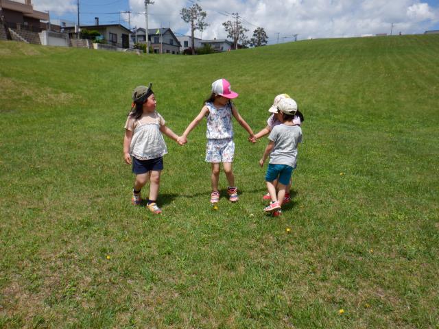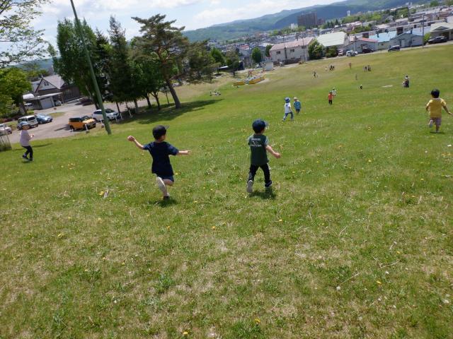 草をさわったりひっぱったり、先生と手を繋いで坂を上ったりと、自然の中で気持ち良く遊んできました!