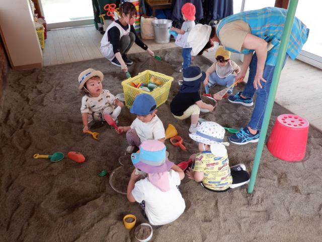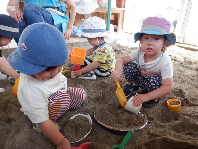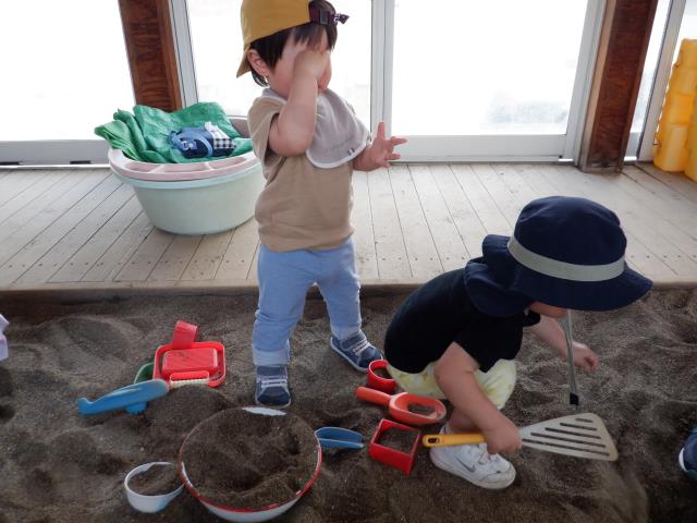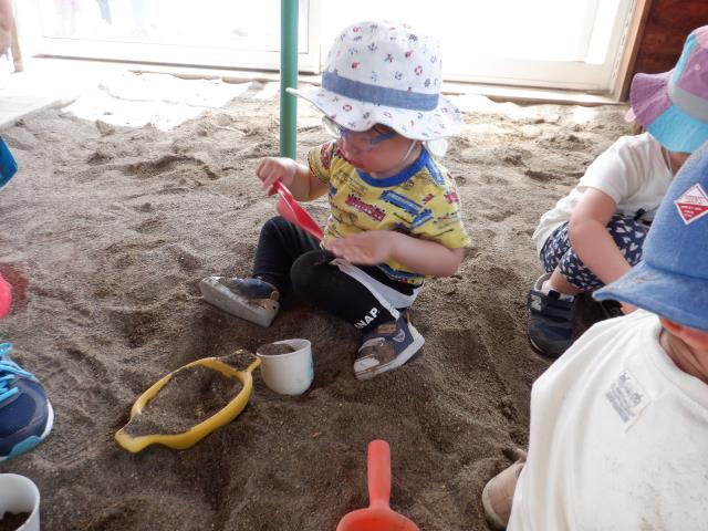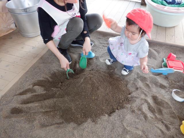 スコップを使ってお皿に砂を入れたり出したり、先生と一緒にお山作りをしたり、お料理を作って「どうぞ」とやりとりもしましたよ!