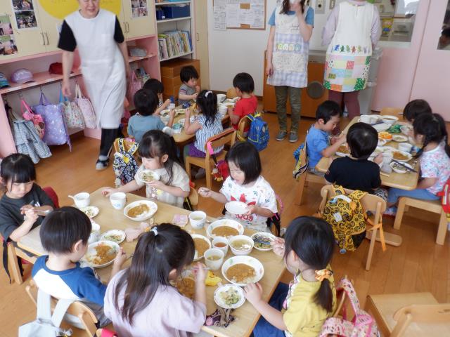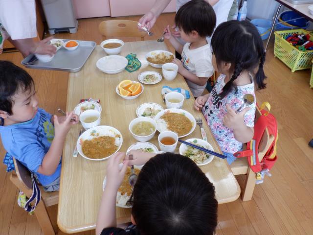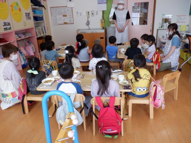 給食先生から、6月4日は虫歯予防デーだったこと、歯を磨いて大切にしてねというお話や、みんながいつも食べている食事や今日のカレーの中に入っている食材は、色々な人が手をかけて作ったものなので大事に食べてね、というお話を聞きました。真剣にお話を聞き、モリモリ給食を食べていたさくらさんでしたよ!フォークの使い方も一人ひとり見てもらい、持ち方の意識も更に高まっていたようでした!