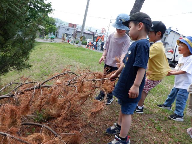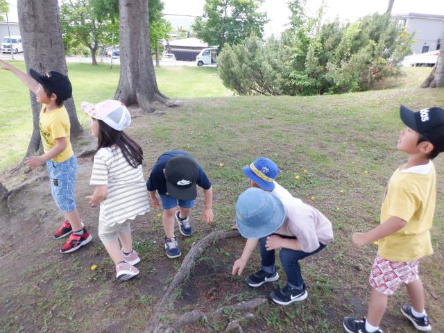 他にも、大きな木の根上がりしているところを「恐竜の骨だ!」とお友達とイメージを膨らませながら喜んでいましたよ。想像力豊かに楽しんでいるすみれさんです♪