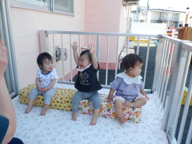 ももさん、お天気が良く暖かい中、バルコニーで朝の会をしました。かえるの歌も先生と一緒に歌いましたよ♪