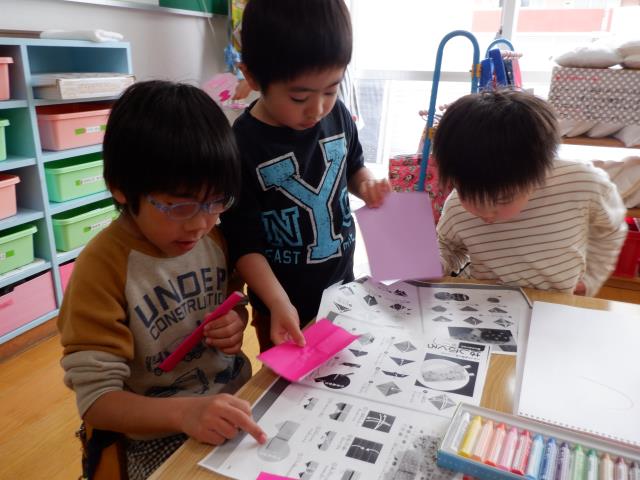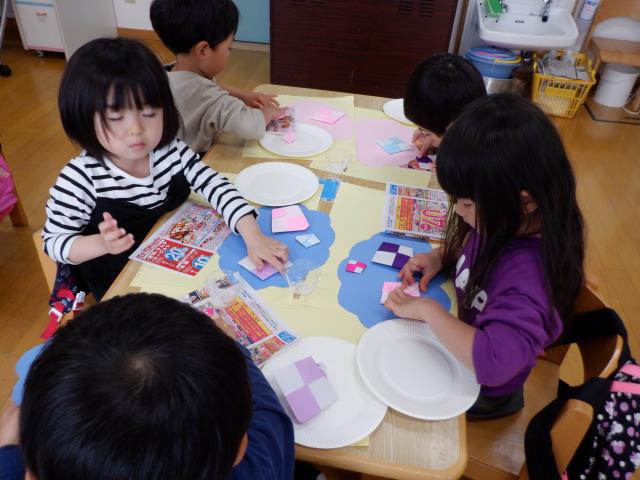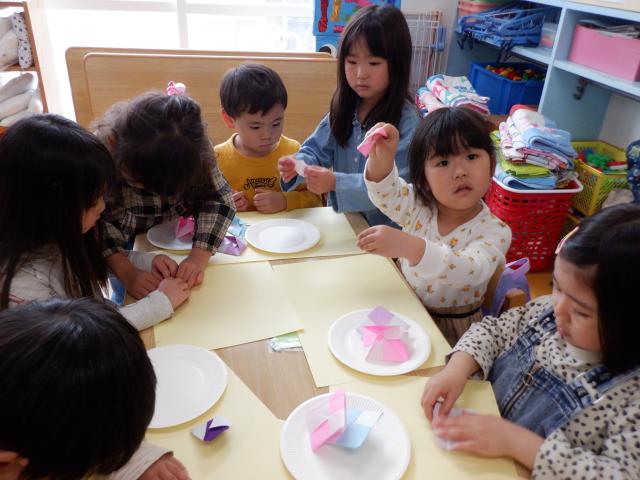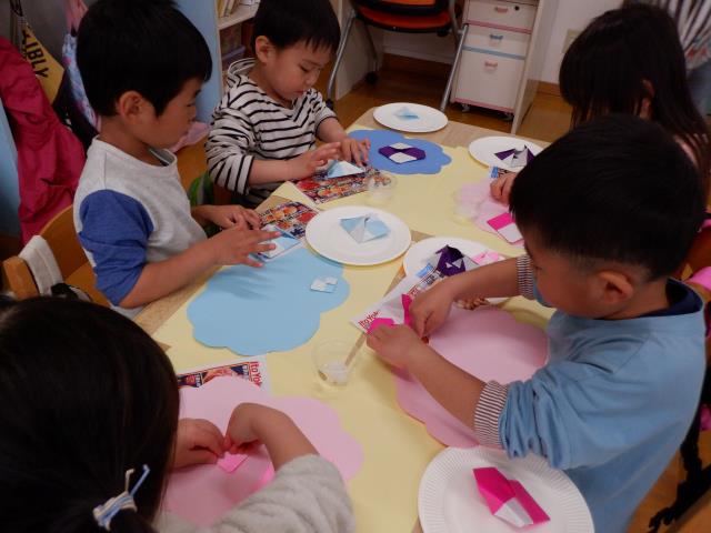 その後は、自分達で折り方を見ながら好きなものを作り、お友達同士で教え合う姿もみられていましたよ。