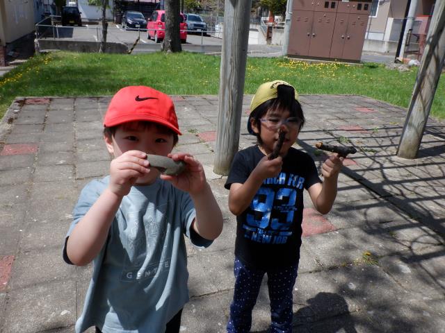 石や枝を見つけて、恐竜の骨!と喜んでいたお友達もいました。