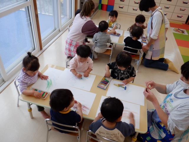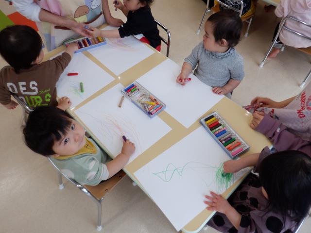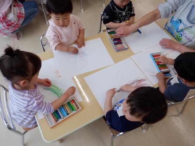 雨降りの今日、ちゅうりっぷさんはクレヨンでお絵かきをしました。好きな色を選んで、自由に描いて楽しんでいましたよ。