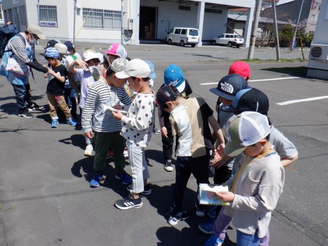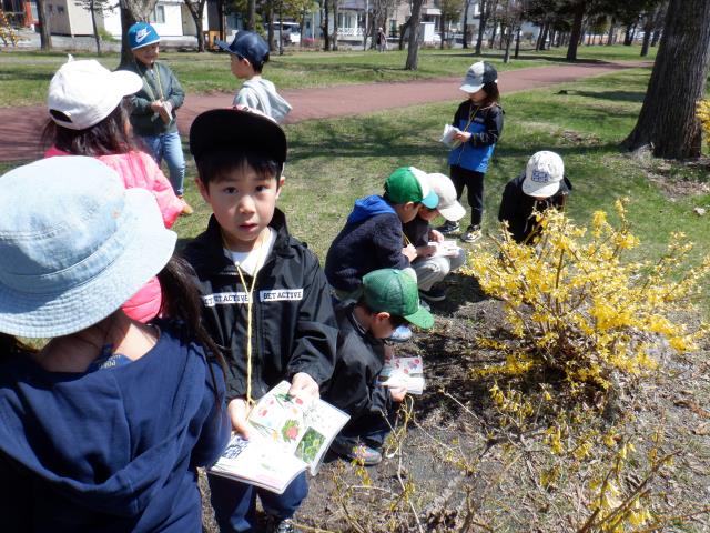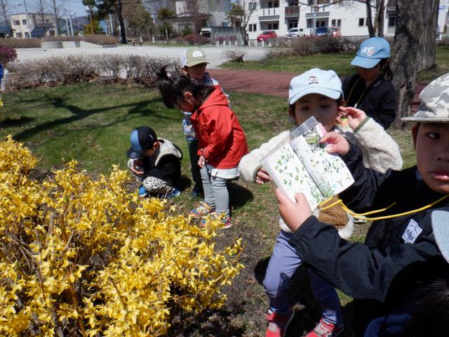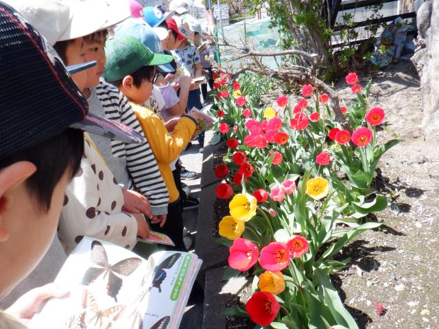 ゆりさん、図鑑を持って園周りのお散歩へ行くと…連休前には咲いていなかったチューリップがきれいに咲いていました!