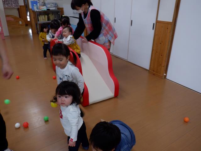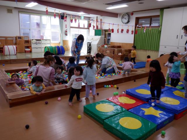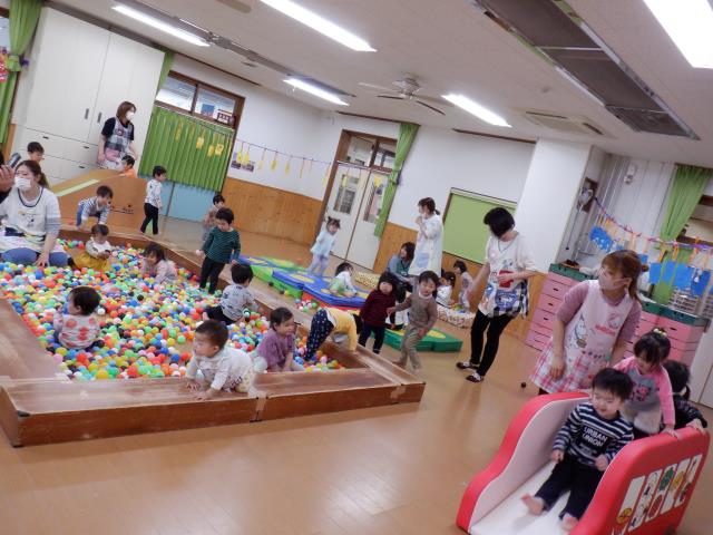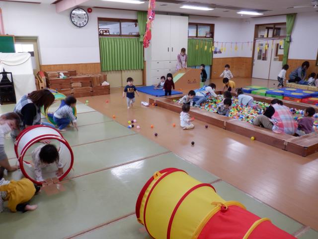 ボールプール、トンネルくぐり、JPマット、すべり台とたくさん遊ぶところがあり、それぞれ遊びたいところに行って、お友達や先生と楽しく過ごしましたよ。