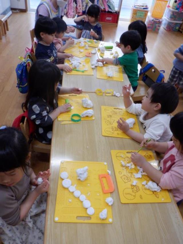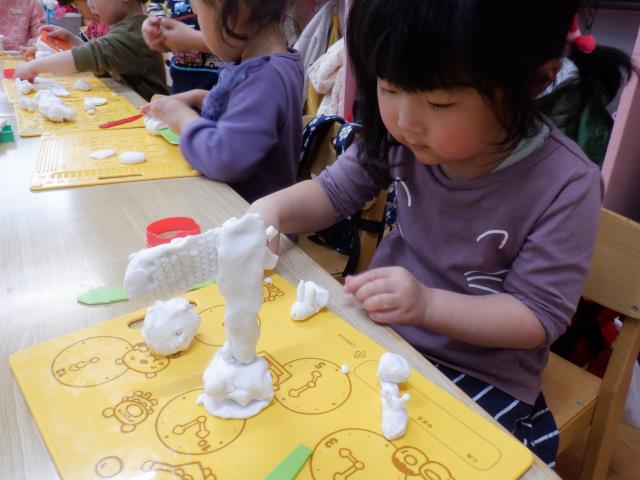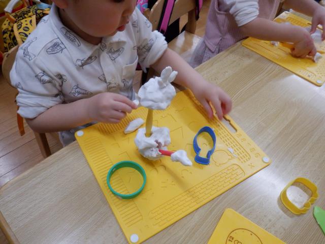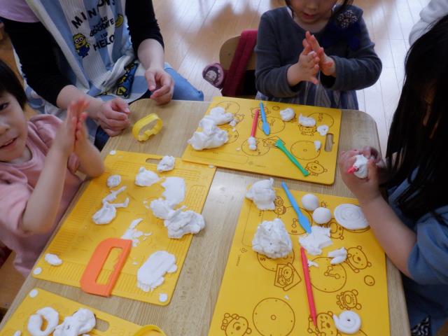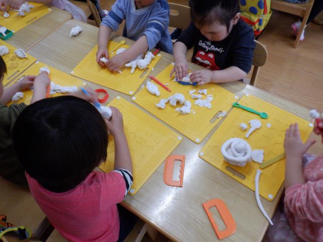さくらさんは粘土あそび。ホットケーキやドーナツを作って、「いらっしゃいませ~!」とお菓子屋さんごっこが始まっていました。美味しそうなお菓子がいっぱいできたね!