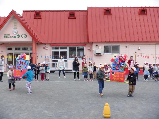 チームは異年齢合同で青・黄・ピンクの3チーム。各クラスで作った手作りこいのぼりを担架に乗せて運んで行きます。