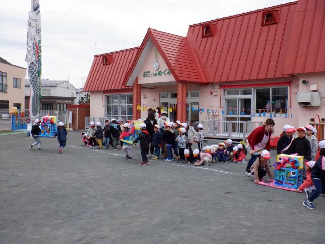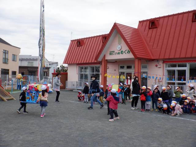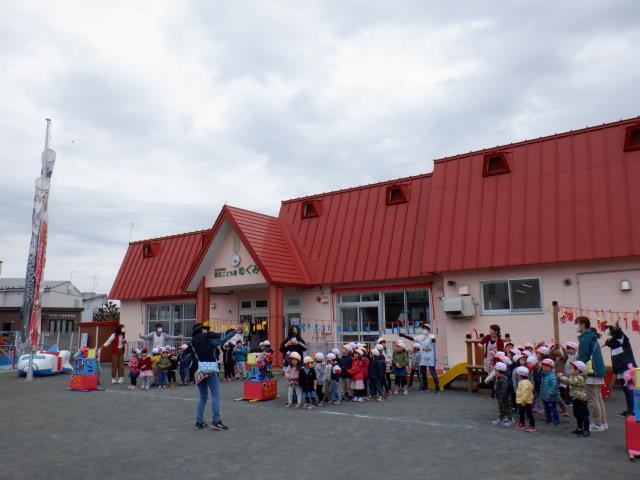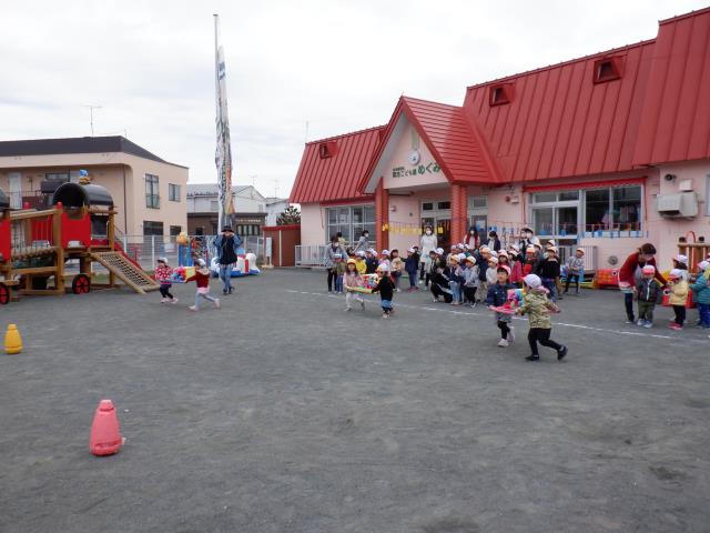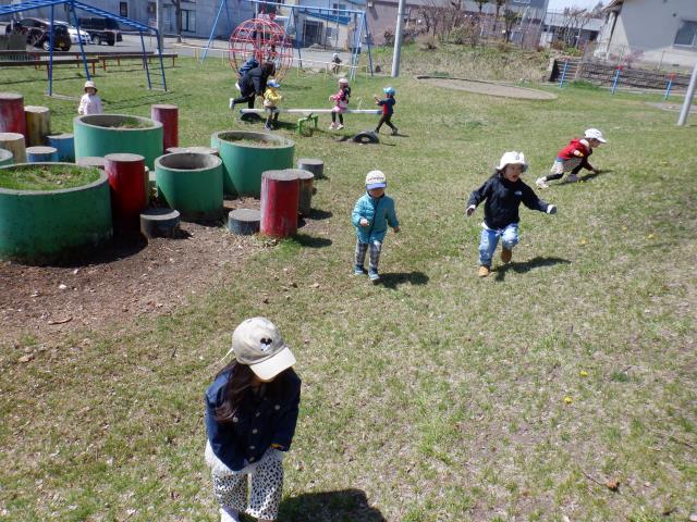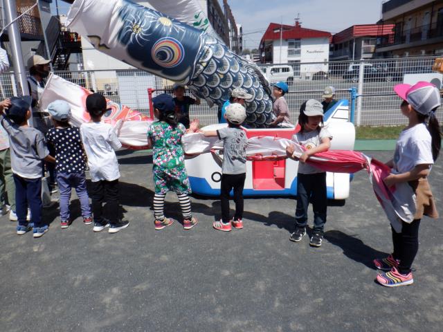 園長先生から、鯉のように元気に遊んでね!とお話を聞き、こいのぼりに見守られる中、みんなで楽しく遊びました!