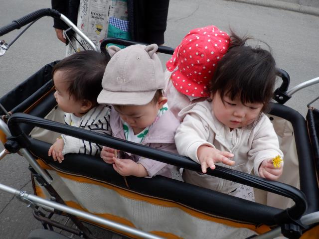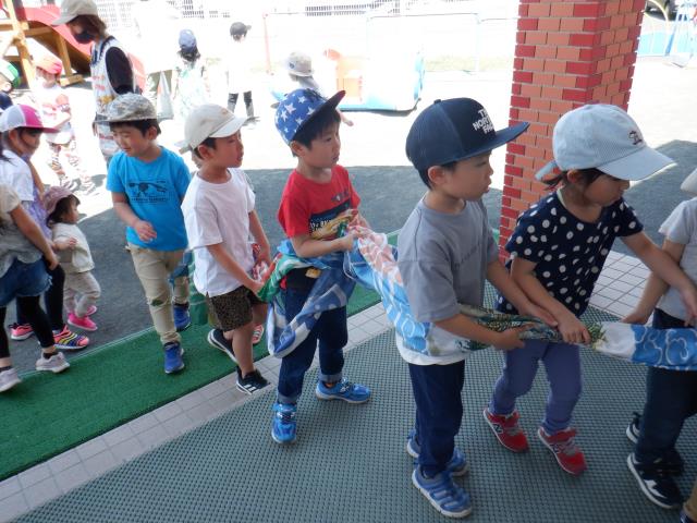 途中で落ちてしまうことも多々ありましたが、また乗せて、お友達と協力し慎重に次のお友達へバトンタッチ。