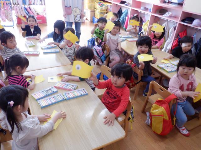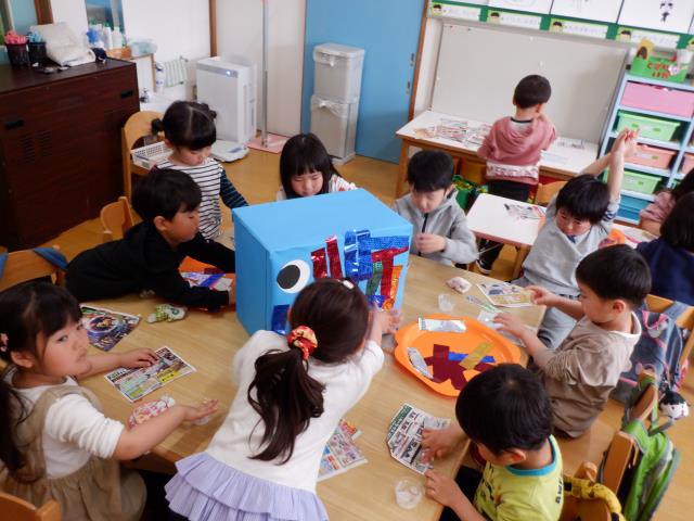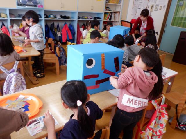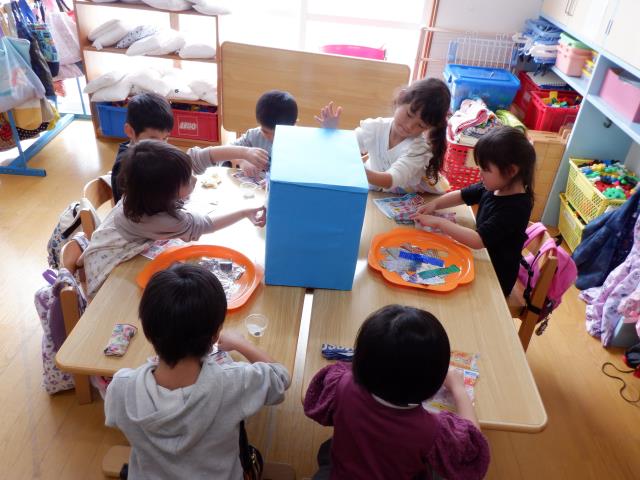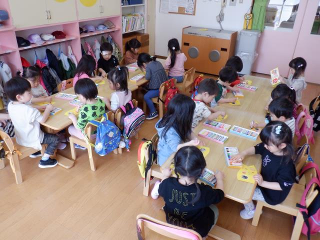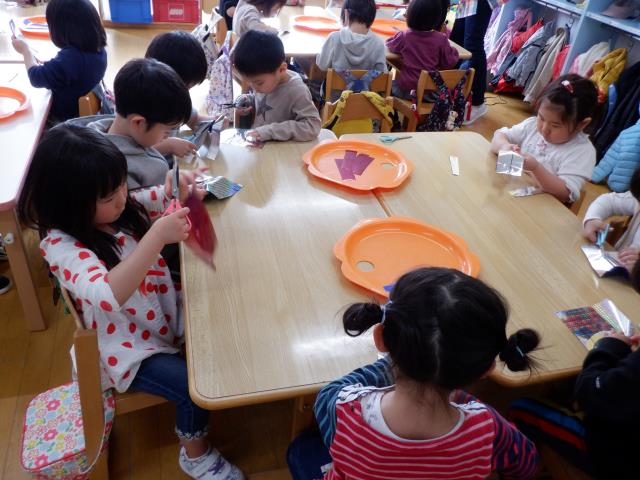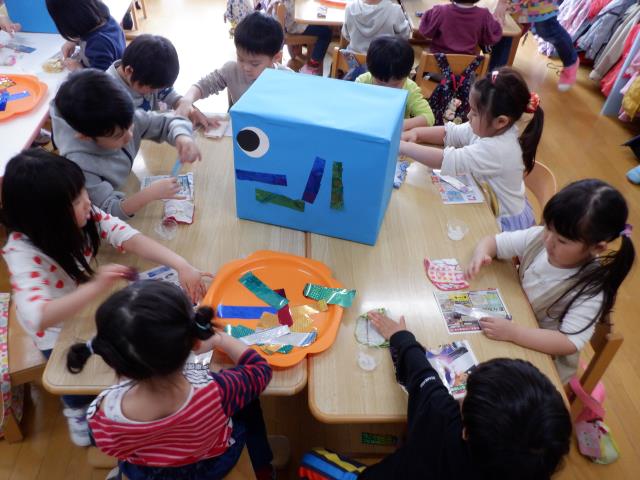 すみれさん、こどもの日の集いのゲームで使うこいのぼりをお友達と一緒に作りました。
