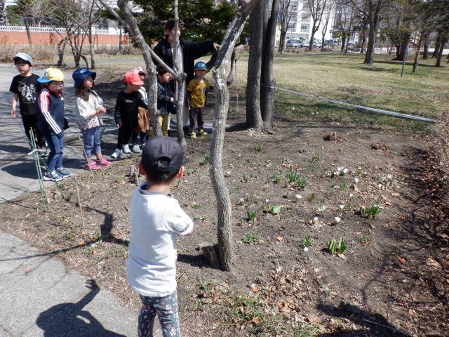 ももさん、お散歩に出かけてチューリップの芽とつつじの花が咲いているのを見つけました。