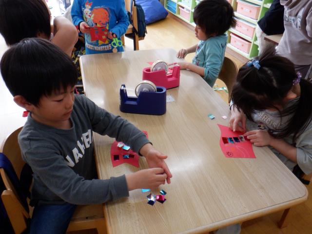 キラキラの折り紙をハサミで切って、のりでこいのぼりにペタペタ貼っていきます。