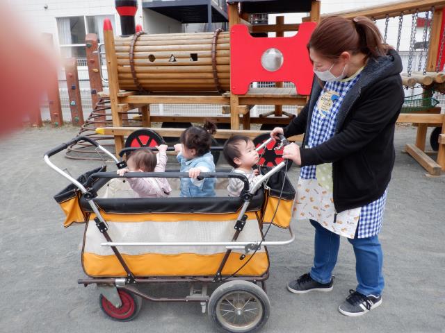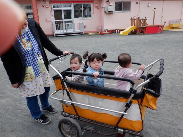 園庭をワゴンに乗ってお散歩した、月齢の高いももさんのお友達です。